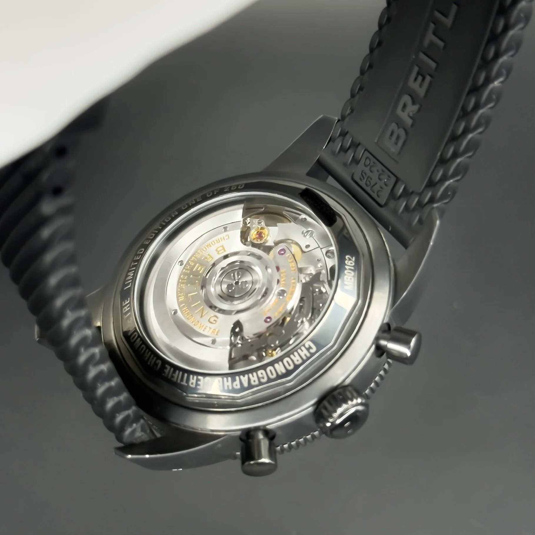 This watch comes with the blue Breitling box, Breitling pillow, Breitling international warranty conditions and maintenance booklet, the Breitling warranty card and two additional straps – uncut brand new Breitling rubber strap as well as a green leather strap.