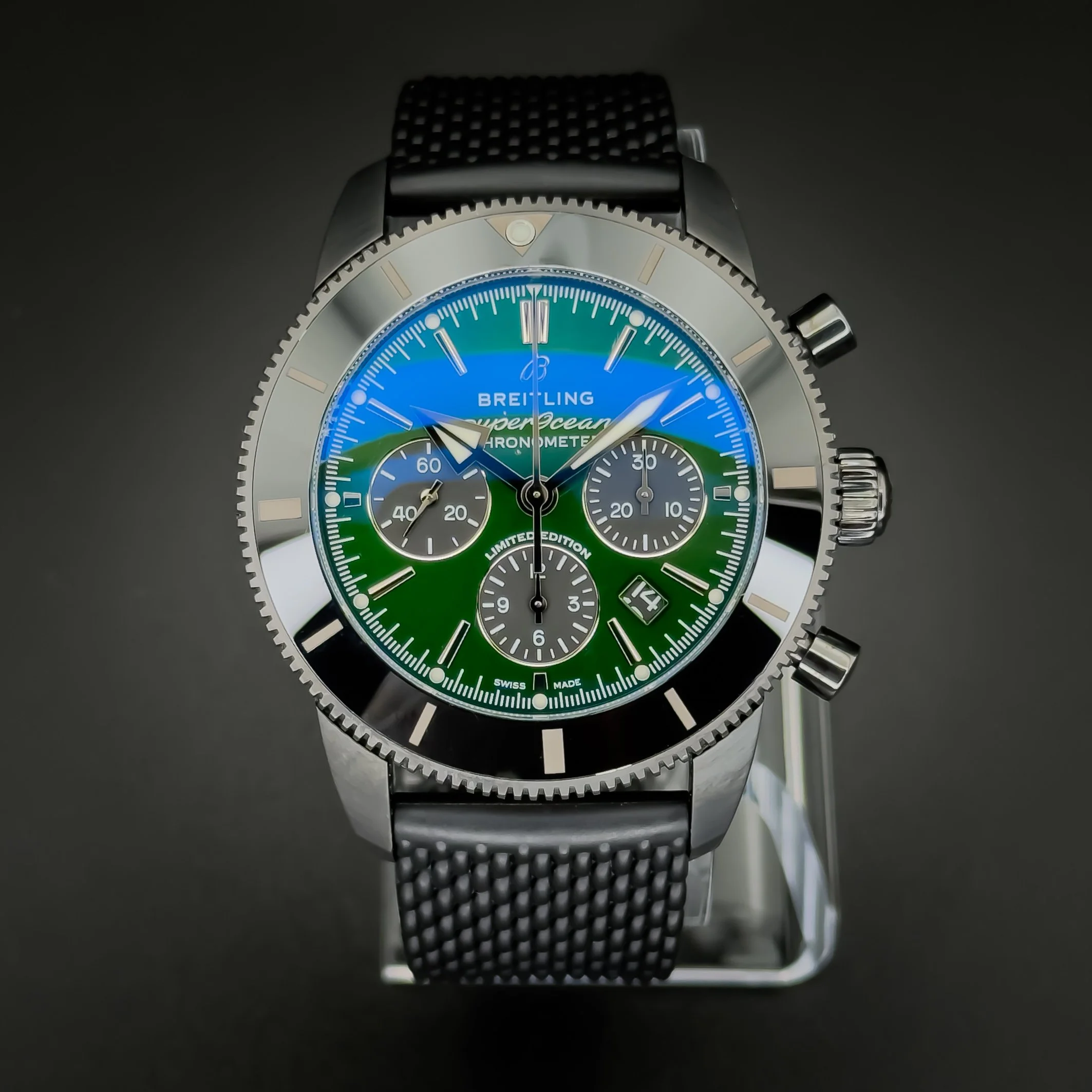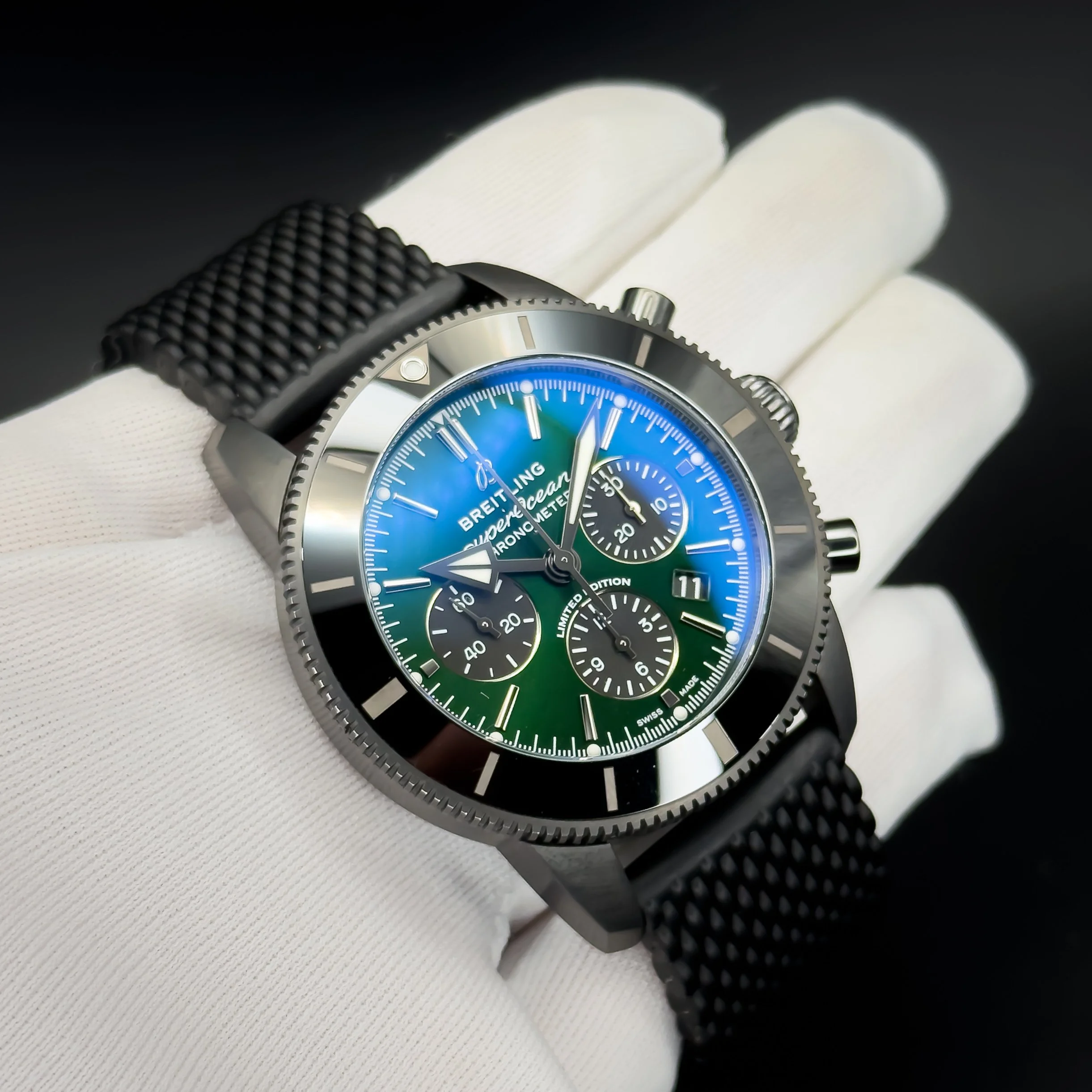 For sale is this beautiful Breitling Superocean Heritage II! This is a limited edition piece with only 250 made! It features a gorgeous black DLC Coated with ceramic bezel and a stunning green sunburst dial. The reference for this timepiece is MB01621A1L1S1.