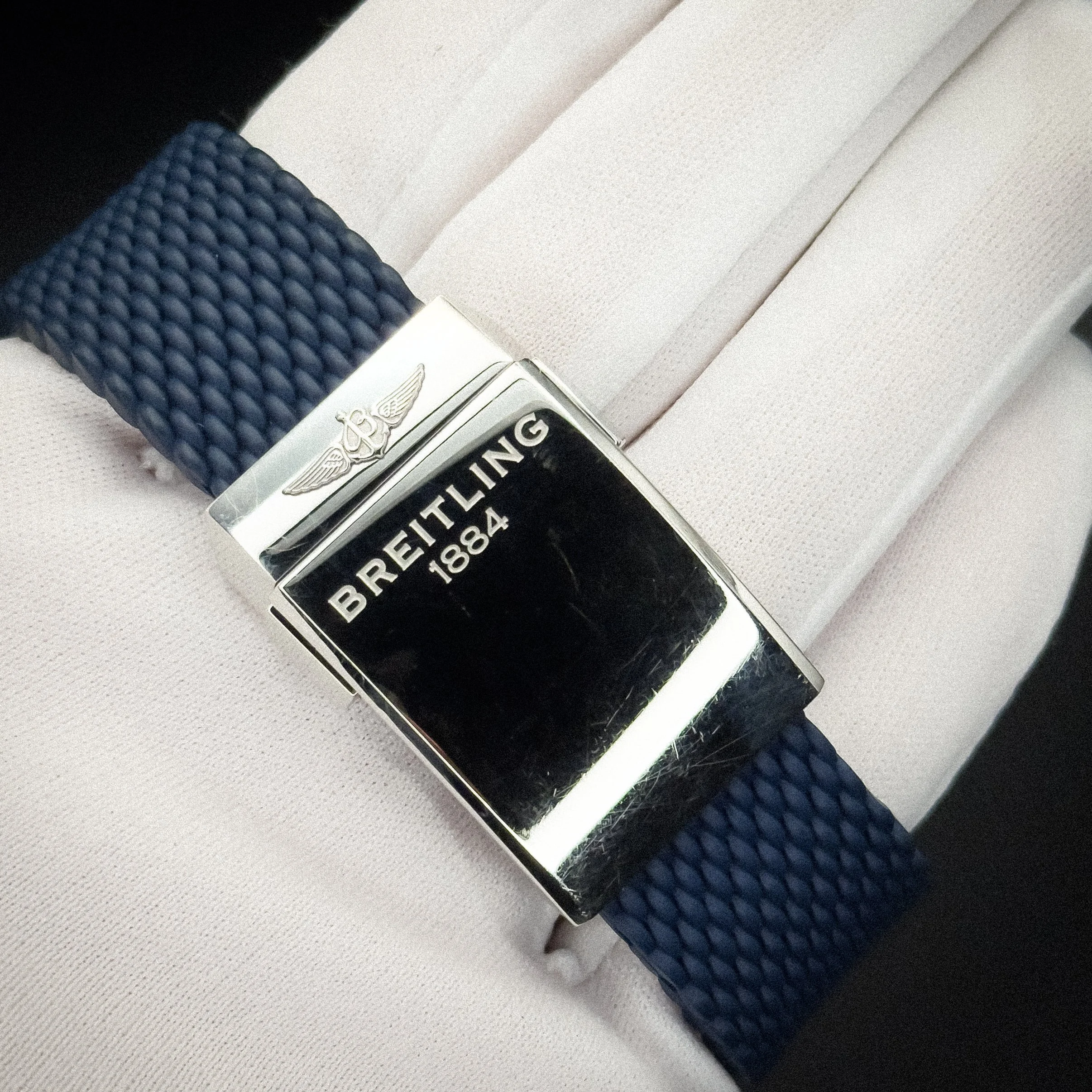 This watch comes with the blue Breitling box, Breitling pillow, Breitling international warranty conditions and maintenance booklet, and the Breitling warranty card.