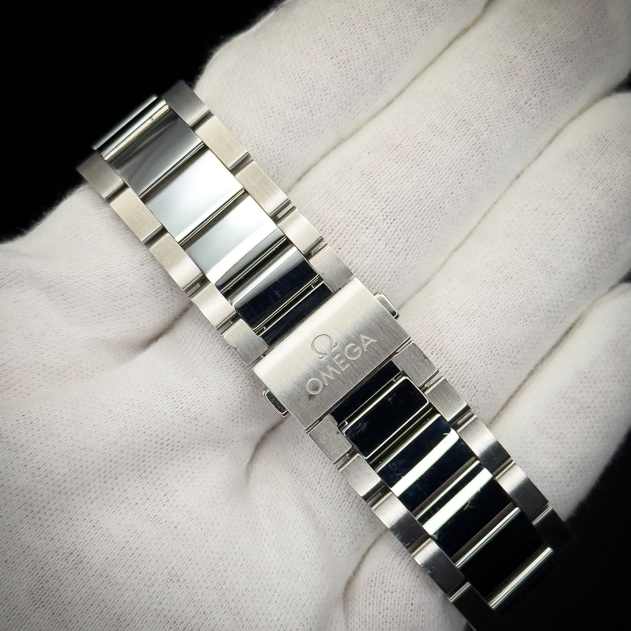 This watch comes with the white Omega outer box, wood Omega inner box, white hang tag, 3 Omega cards – pictogram card, master chronometer and international warranty card dated, and all of the links.