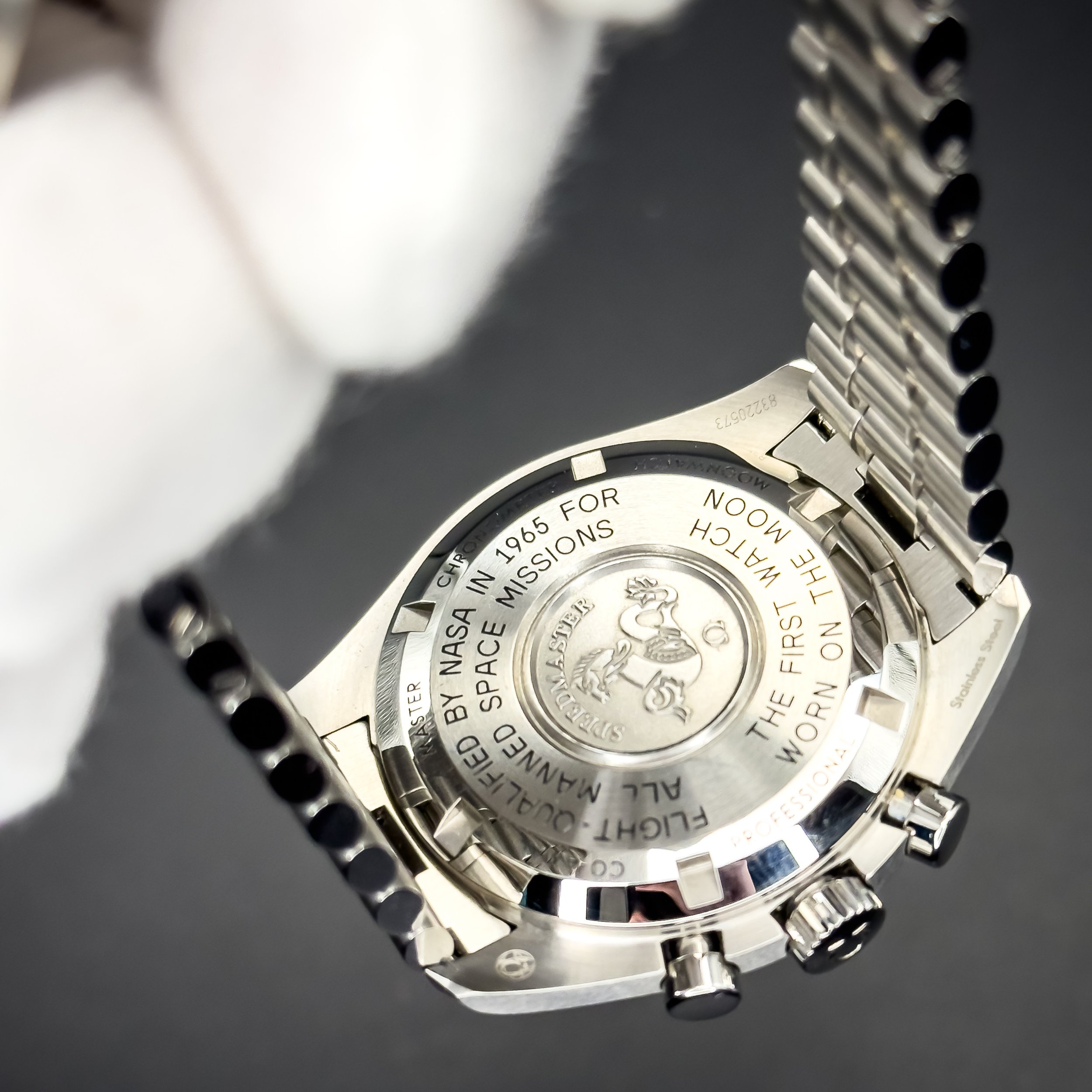 Caseback: Solid steel with the engraved Seahorse medallion, and “Flight-Qualified by NASA for all Manned Space Missions” / “The First Watch Worn on the Moon” inscription