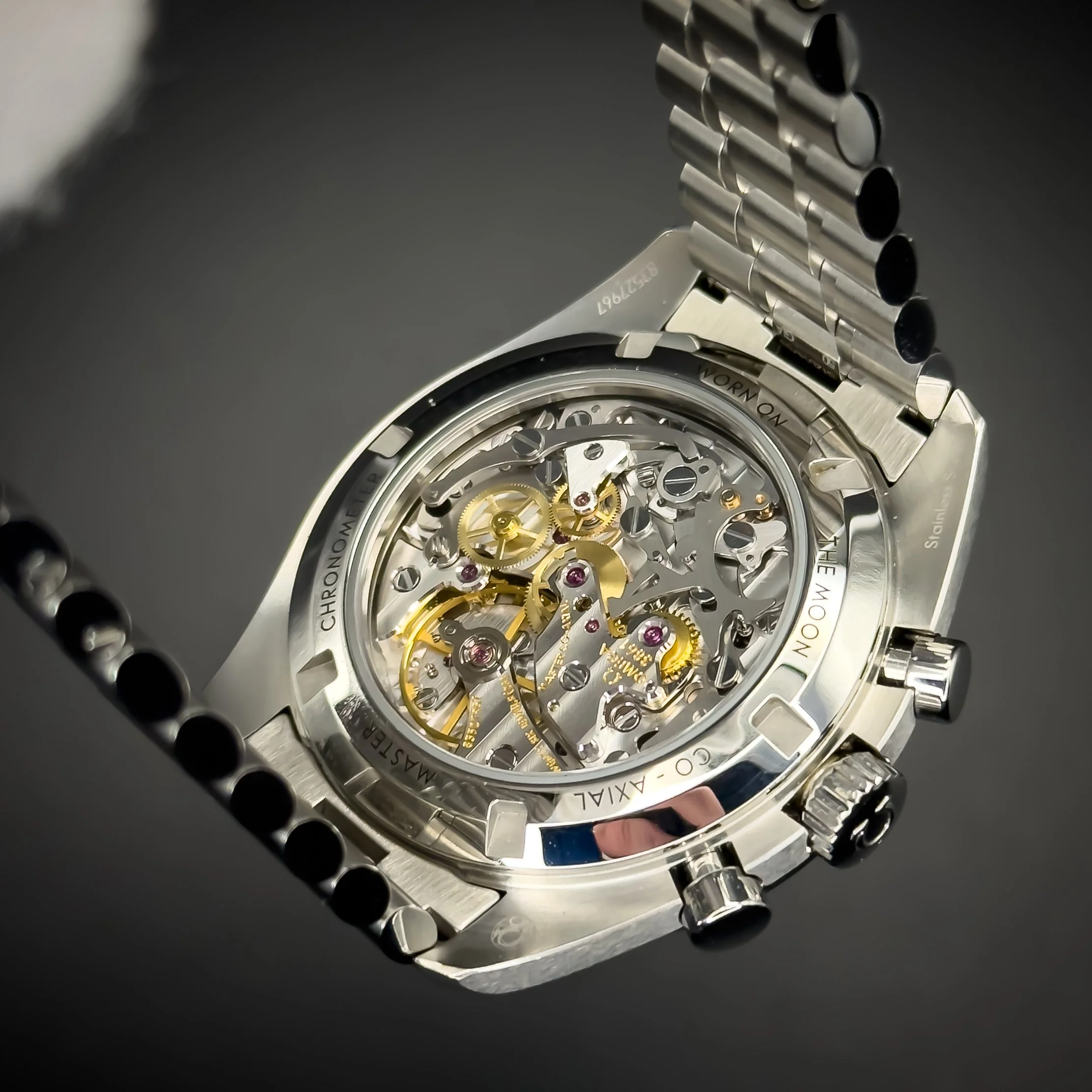This watch comes with the inner and outer Omega box, Omega pillow, 3 Omega cards – pictogram card, master chronometer and international warranty card dated, the special Moonwatch booklet and all of the links.