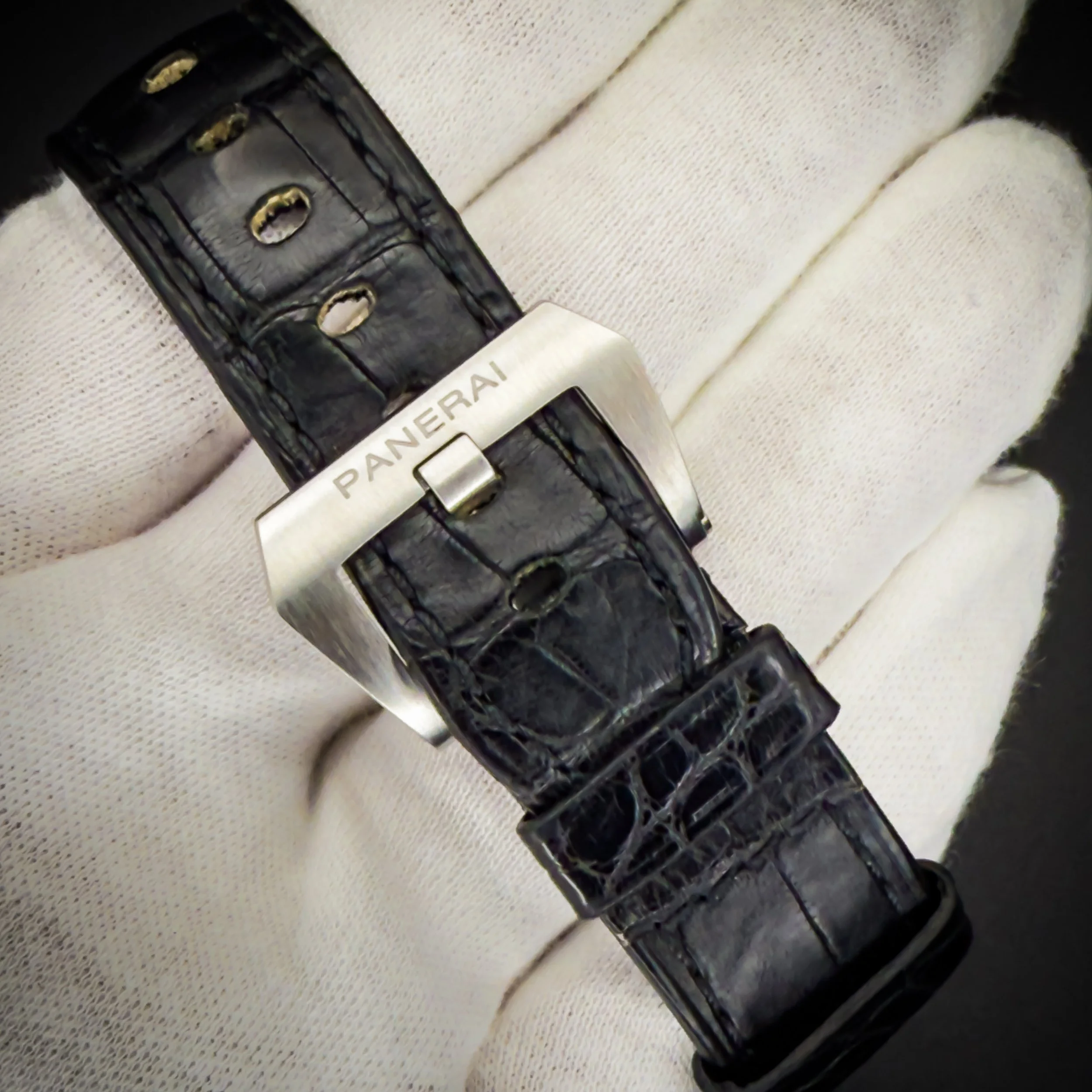 This watch comes with the inner and outer Panerai box, Panerai pillow, Panerai international warranty booklet and warranty card, the maintenance booklet, both Panerai tools and an additional brown strap